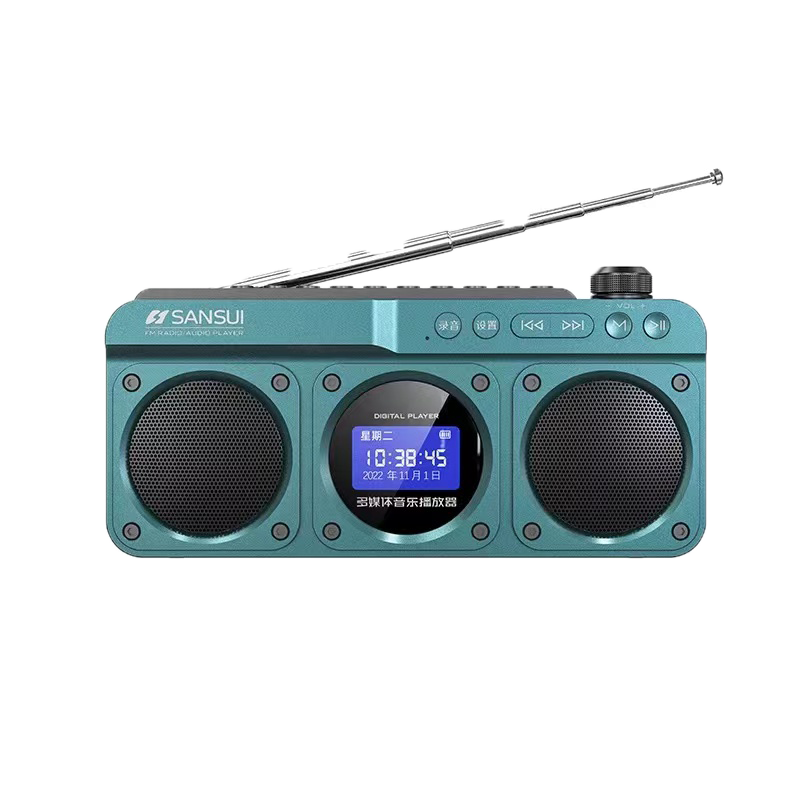 米跃山水F28是一款功能强大的便携设备。它集FM收音机、插卡蓝牙音响、双喇叭立体声录音机以及数字选歌功能于一身。其拥有蓝色的外观,时尚又美观。