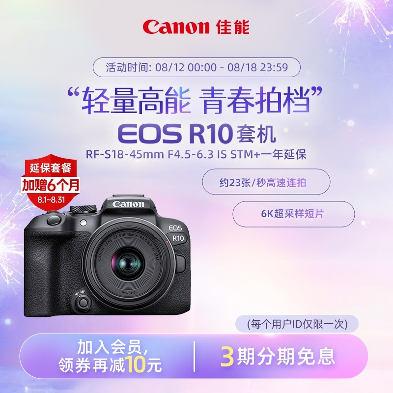 佳能EOS R10 APS - C画幅微单相机正在天猫商城促销。其机身颜色为黑色,镜头组合是EOS R10套机RF - S18 - 45mm F4.5 - 6.3 IS STM,配件套餐为官方标配。这款相机配备新开发的APS - C画幅图像感应器,有效像素数最高约2420万,配合DIGIC X数字影像处理器,画面清晰度、噪点表现、光学性能等多方面得以提升。照片拍摄常用感光度达ISO 32000,可扩展至ISO 51200。它的全像素双核CMOS AF相位对焦系统有4503个相位检测点和651区自动对焦区域,最高可实现23张/秒高速连拍。还搭载基于HDR PQ的新HDR照片模式,首次在EOS系列机型中配备高分辨率全景图像拍摄功能和相机内景深合成功能,支持全像素双核RAW,可根据被摄体景深信息微调画质效果、微调拍摄视点并减少鬼影,也支持高分辨率全景图像合成。