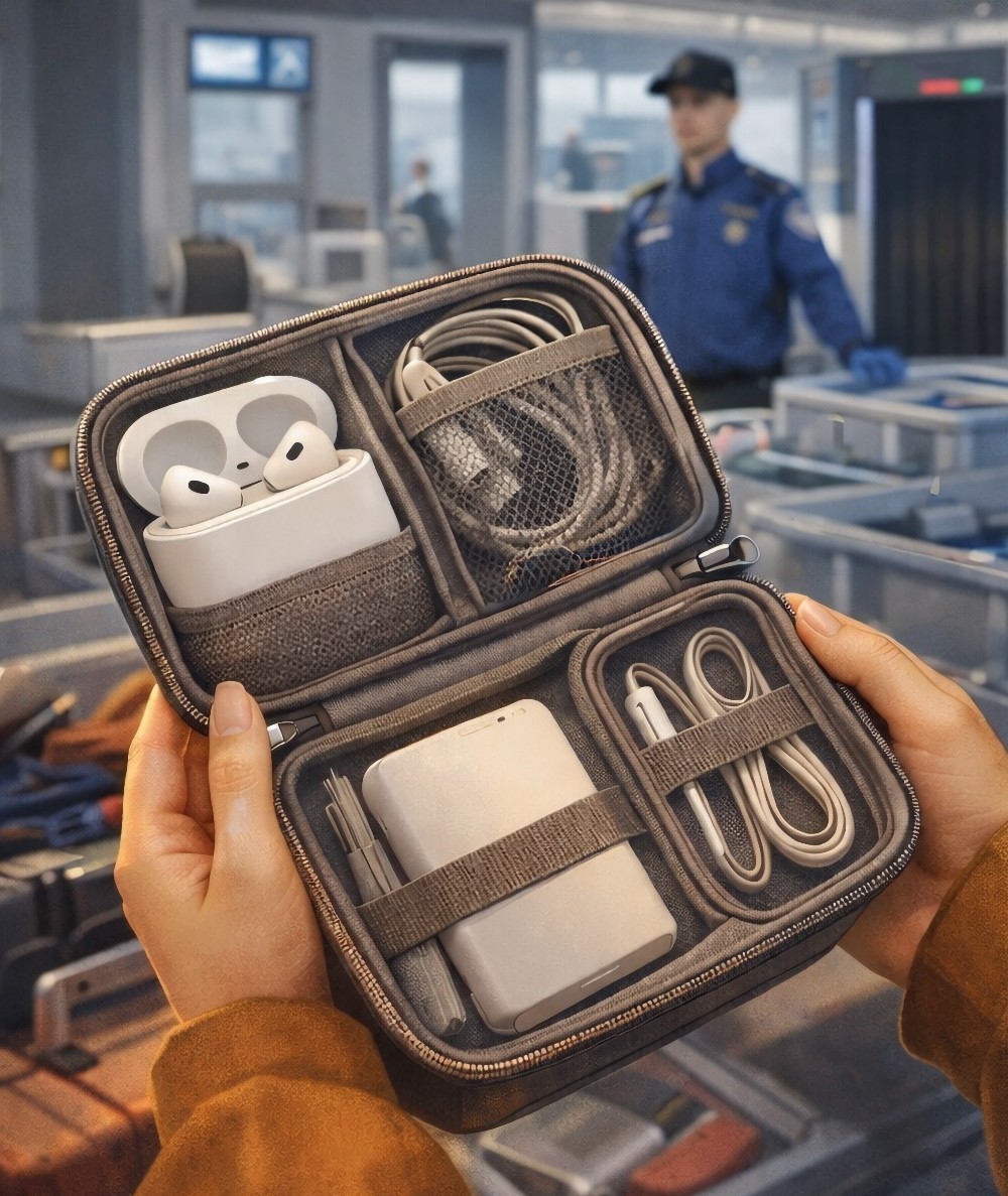 后来我给自己定了一个原则:所有“可能被问到、可能被掏出来的东西”,必须在一个袋子里。就一个小收纳包:耳机、充电宝、线材、转接头、身份证。过检的时候你只需要把这一包拎出来,再也不用慌乱。