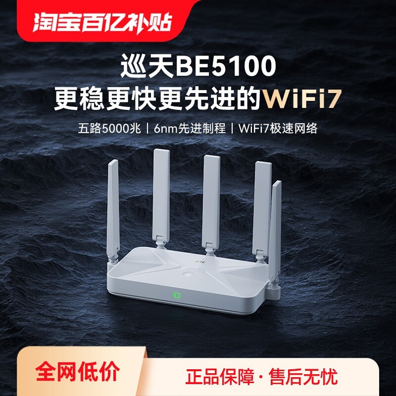 中兴巡天BE5100智能路由器现已在天猫商城开启百亿补贴促销活动,当前补贴价为330元,在商品详情页还可领取一张减121元的优惠券,最终到手价仅需209元,性价比极高,喜欢的朋友千万不要错过。这款路由器是中兴于2024年4月22日推出的全新WiFi7产品,搭载中兴自研十核双引擎主控芯片和6nm WiFi7双频无线基带芯片,支持2.4GHz与5GHz双频段,在4K QAM和MLO技术的加持下,并发速率最高可达5012Mbps,带来更快更稳的网络体验。