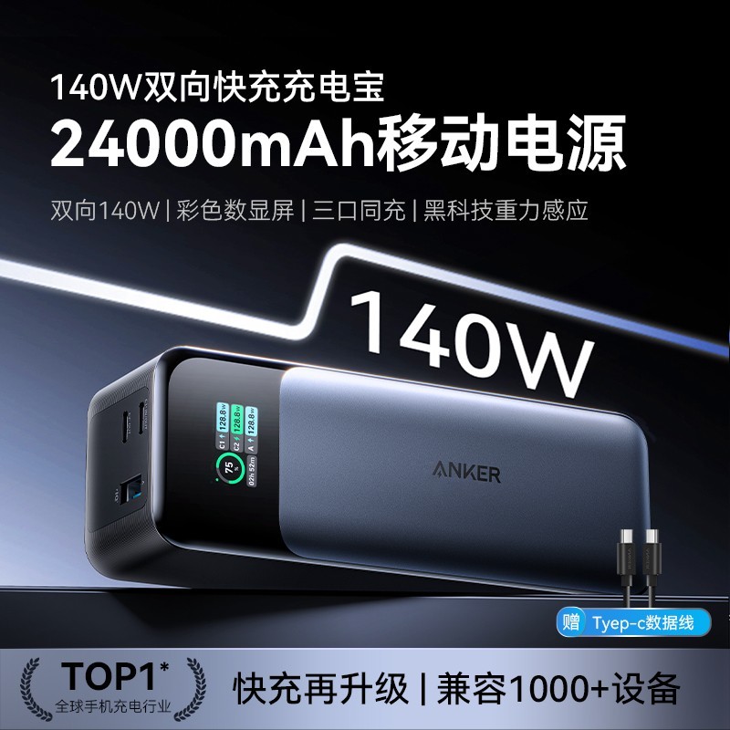 安克 737 移动电源 24000mAh 140W,采用源自宇航服头罩的设计语言,外观科技感十足,内置智能数显TFT彩屏,科技感十足的UI设计可实时展示充电数据,满足用户对高颜值与实用性的双重需求。该移动电源支持PD3.1充电协议,单C口输出功率高达140W,USB-A口也可达18W,具备高输出与高转换效率,配备自研PowerlQ 3.0兼容技术,兼容超过1000台设备,适用性广泛。同时搭载Al智能控温技术2.0,智能调节温度保障充电安全,并配有高品质充电头,稳定性强,适合长时间旅行或户外使用。大容量电池可多次为设备充满电,符合航空携带标准,出行无忧。