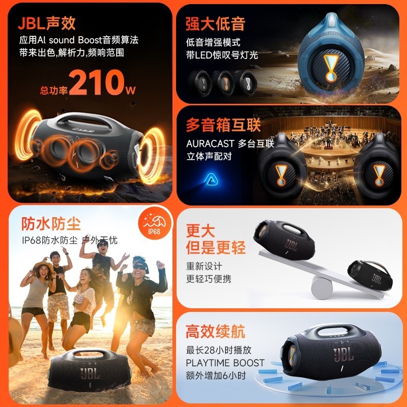 JBL音响BOOMBOX4音乐战神4代无线便携户外蓝牙音箱正在热卖!这款音箱防尘防水等级达到IP68,无论是恶劣天气,还是不小心打翻饮料的情况都能轻松应对。在低音方面有多种选择,经典JBL招牌低音,喇叭标志亮起橙光时是深沉低音模式,亮起白光则是动感澎湃的PUNCHY BASS模式...