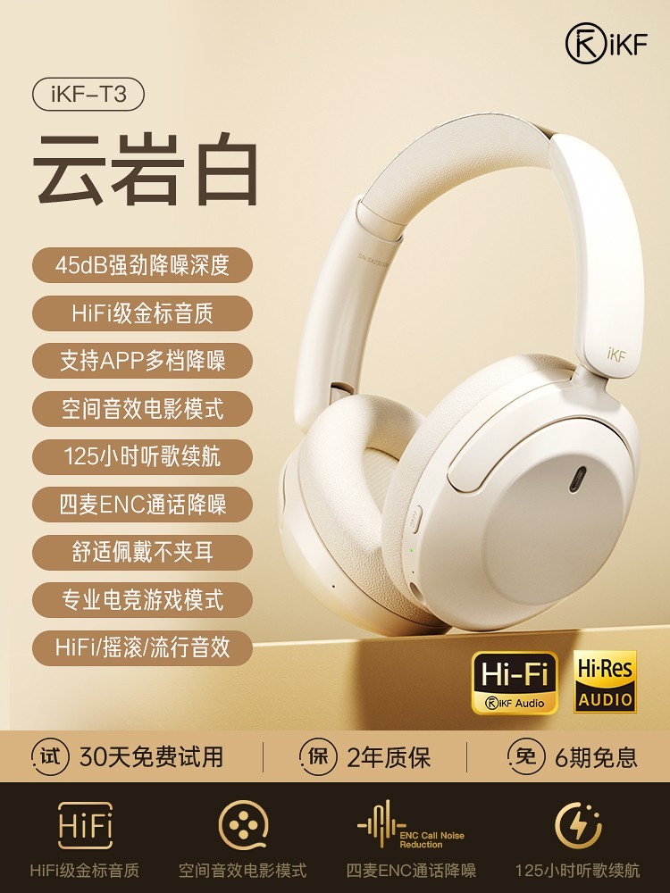 iKF T3主动降噪头戴式蓝牙耳机,适用于苹果、华为、荣耀等设备,无论是电脑电竞游戏还是上网课都非常合适。它有多种功能亮点,像雾霾蓝款支持APP三档降噪,还有125小时续航,并且支持APP拓展。而云岩白款更具特色,拥有HiFi级金标音质,具备45dB降噪深度以及125H超长续航,还有APP多档降噪。