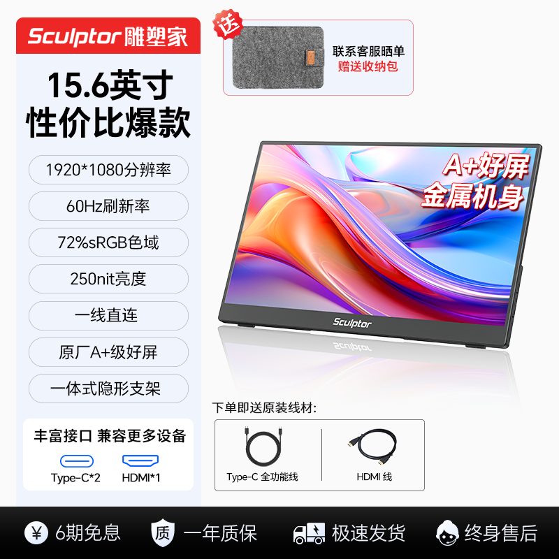 雕塑家sculptor MR156LU 15.6英寸IPS显示器正在天猫商城促销。这款显示器有着高品质IPS显示屏,能带来出色的视觉体验,支持3840×2160分辨率、60Hz刷新率、具备100%RGB色域与HDR400,显示效果十分出色。它拥有多种显示模式,可满足不同场景需求,外观设计简洁,还具备易携带的特点,且提供多种连接方式,能适配不同设备。其规格为屏幕尺寸15英寸,颜色分类有15.6英寸60Hz/1080p/72%RGB色域/支持壁挂/金属机身。