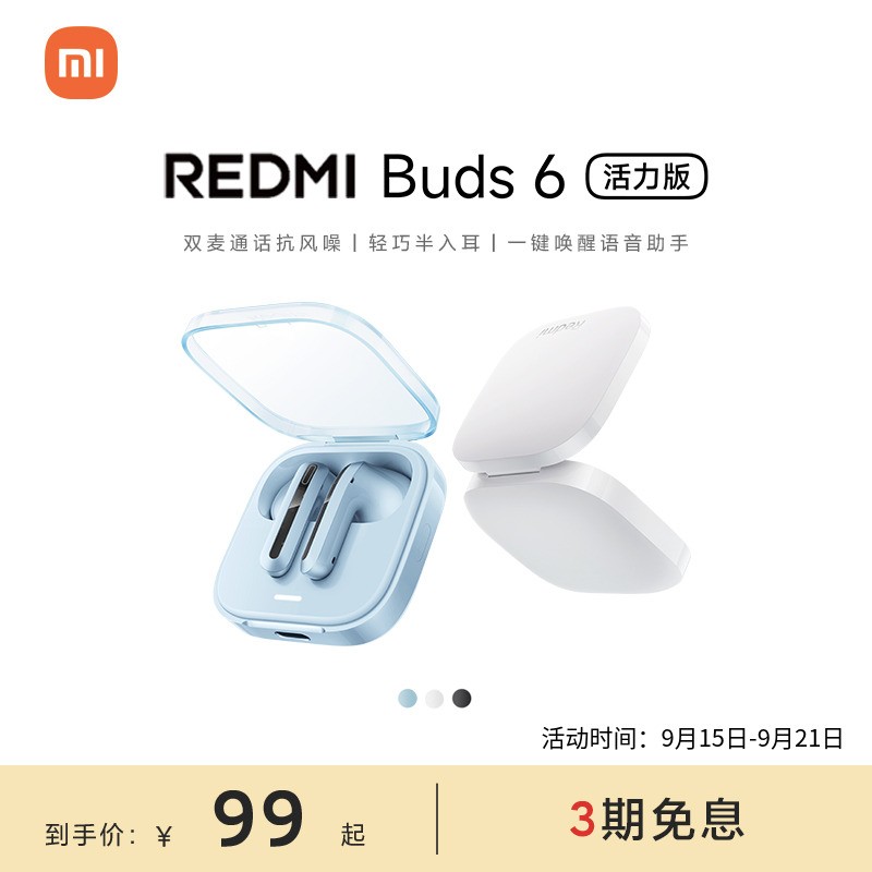 小米 Xiaomi 红米 REDMI Buds 6 活力版真无线蓝牙耳机现正在天猫商城促销,原价109.00元,现在最终到手价仅需99元,性价比超高,喜欢的朋友千万不要错过。Buds 6 活力版提供白色、黑色、蓝色三种配色,采用舒适的半入耳设计,搭载14.2mm大尺寸动圈单元,内置五种调音模式,轻松应对日常通勤、运动健身、游戏娱乐等多种听音场景。耳机支持30小时超长续航,充电10分钟即可播放音乐1小时,应对紧急使用毫无压力。同时支持双麦克风波束成形技术,最高可达4m/s通话抗风噪能力,户外使用也能清晰通话。耳机还支持一键唤醒语音助手、蓝牙5.4连接技术以及网易云硬件音效认证,带来更智能便捷的听觉体验。具备IPX4级别防尘防水性能,日常使用更安心。现在入手正当时,赶快行动吧!