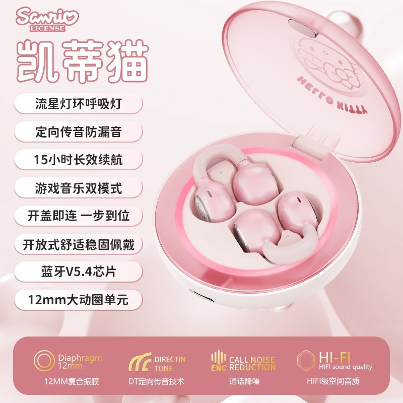 毒音三丽鸥HelloKitty蓝牙耳机不入耳夹耳挂式SR02新款专为女生设计是一款集时尚与实用于一体的蓝牙耳机,采用不入耳夹式设计佩戴舒适稳固,特别适合长时间使用凯蒂猫造型搭配精美珍珠耳夹尽显甜美风格耳机配备流星灯环呼吸灯效果科技感十足同时搭载DT定向传音技术有效减少漏音带来更私密的听觉体验支持高清无损音质通话清晰传输稳定蓝牙连接快速便捷适用于多种场景无论是通勤上课还是运动休闲都能轻松驾驭目前在天猫商城促销活动中使用满40元减40元优惠券后仅需119元即可入手原价159元喜欢这款可爱又实用的耳机的朋友不要错过现在下单还赠送礼袋非常适合作为女生礼物送出