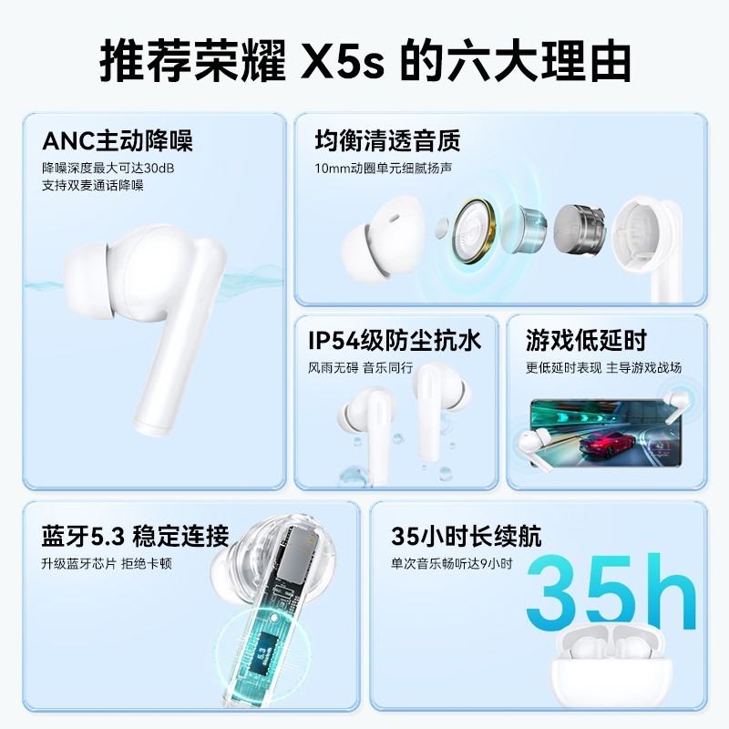 荣耀HONOR亲选LCHSE X5s蓝牙耳机,真无线设计,专为运动爱好者打造,轻巧入耳式耳塞贴合耳道稳固舒适,支持通话降噪技术,无论跑步、健身还是通勤,都能畅享清晰语音交流。超长待机时间满足全天候使用需求,兼容苹果与安卓设备,连接稳定快速。