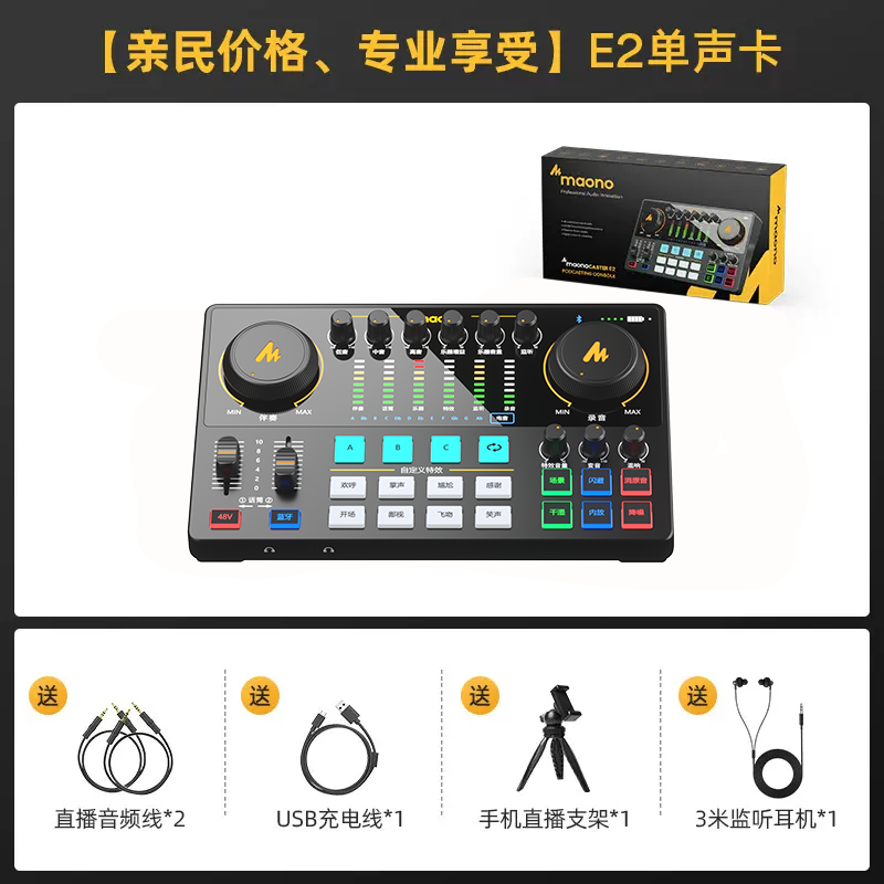 闪克maono Sudotack E2声卡套装直播设备全套现已开启限时特惠,专为抖音主播、K歌达人、录音配音及户外收音设计,功能强大性能稳定。本款E2黑色单声卡配备专业级音频处理技术,支持实时音效调节、降噪收音和多设备连接,无论是手机直播还是录音创作都能轻松应对。套装包...