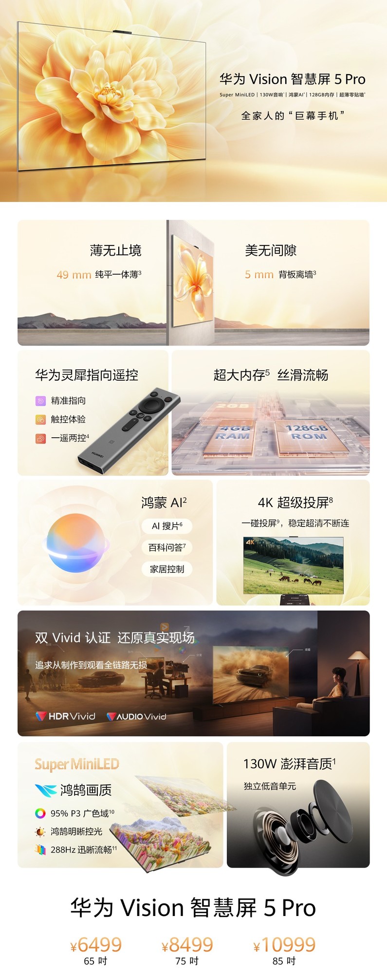 本文属于原创文章,如若转载,请注明来源:华为发布Vision 智慧屏 5 Pro:双Vivid认证,130W音响与零贴墙设计https://dcdv.zol.com.cn/1052/10523641.html