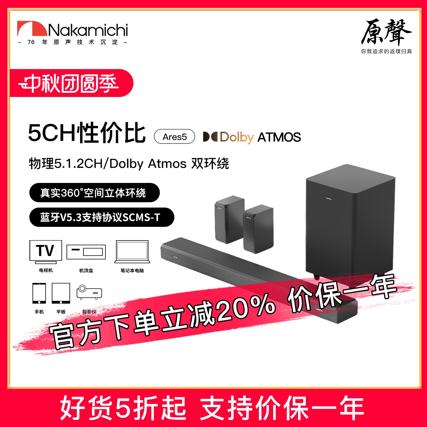 Nakamichi中道Ares5是一款真5.1.2声道的电视投影仪音箱,可打造家庭影院回音壁。它能为用户带来沉浸式的视听体验,仿佛置身于真实的影院场景之中。