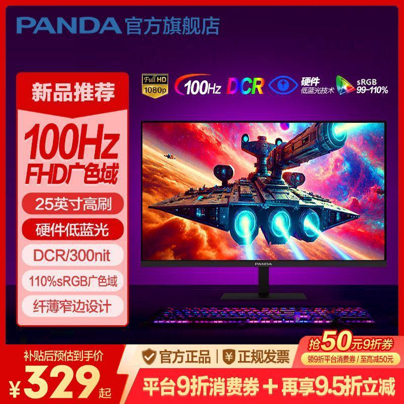 熊猫25英寸100Hz高清FHD1080P游戏办公显示器,现参与拼多多百亿补贴大促,活动售价378元,下单享满1件打9.5折再叠加领取消费券立减50元,最终到手价仅需309元,性价比出众。这款显示器采用25英寸大屏设计,分辨率达1920×1080 Full HD高清标准,支持100Hz高刷新率,画面流畅顺滑,无论是畅快游戏还是日常办公都能带来更清晰、更稳定的视觉体验。窄边框时尚外观,节省空间,适配多种使用场景,接口丰富兼容性强,轻松连接台式机、笔记本等多种设备,是居家学习、办公娱乐的理想之选,现在入手仅需309元,机会难得不容错过。