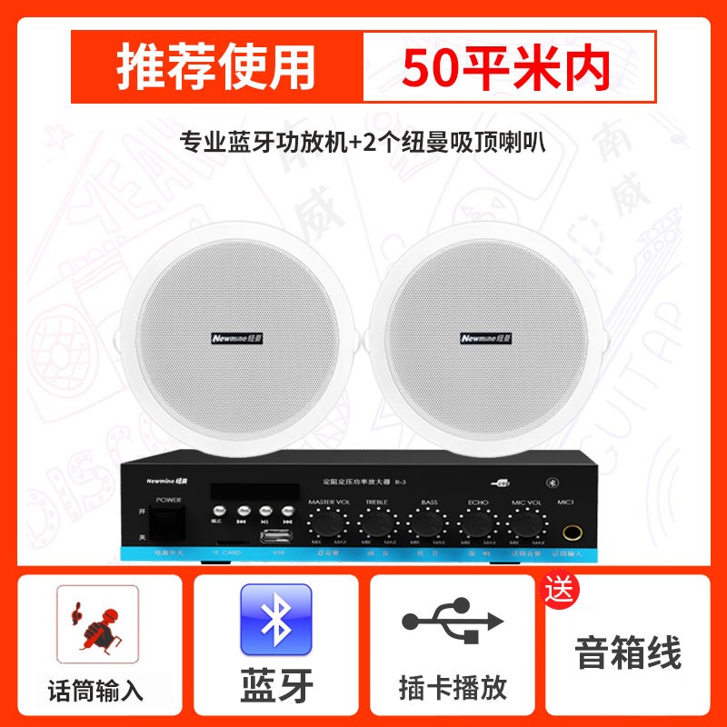 纽曼Newmine吸顶式音响箱,适用于客厅家用,也很适合店铺装修、会议室使用,能为空间打造美妙的背景音乐氛围。这款音响箱是功放套装,可安装在天花板上。