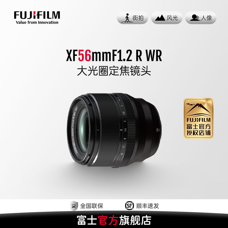 富士FUJIFILM XF 56mm F1.2 R WR中远摄定焦镜头,采用富士X卡口,口径67mm,颜色为经典的黑色,配件为官方标配。这是一款大光圈定焦镜头,中远摄焦距为56mm(等效35mm格式85mm焦距),F1.2超大光圈搭配11片光圈叶片,营造出迷人的虚化效果。其8组13片镜头结构,包含一片ED镜片和2片非球面镜片,比前代型号有更高的图像分辨性能。对焦组多达8片镜片,能最大限度减少色差、球面像差和彗形相差,从最近对焦距离到无限远都有出色的图像分辨表现。自动对焦由改进的直流马达驱动,即使光圈全开也能快速准确对焦。镜头仅重445g,长度76mm,设计紧凑轻便。镜身有9处密封点,防尘防滴,能在低至 -10°C的温度下正常工作,前部镜片还有氟涂层,防水滴、防污渍,非常适合肖像、商业、静物摄影。