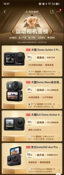 本文属于原创文章,如若转载,请注明来源:大疆全景相机热卖第一、运动相机全面霸榜京东金榜https://dcdv.zol.com.cn/1067/10679502.html