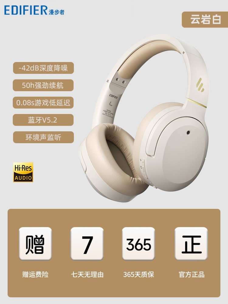漫步者W820NB耳罩式头戴式主动降噪蓝牙耳机是一款性价比很高的降噪耳机。它采用40mm镀钛复合振膜,拥有2倍频宽,能展现更多音乐细节,还获得了HiRes小金标认证,音质高清。具备38dB混合主动降噪功能,降噪效果佳。续航能力也十分出色,可达50h持久续航。此外,它配有独家专利眼镜缓压耳套,佩戴舒适且密闭性好,外观也十分美观。