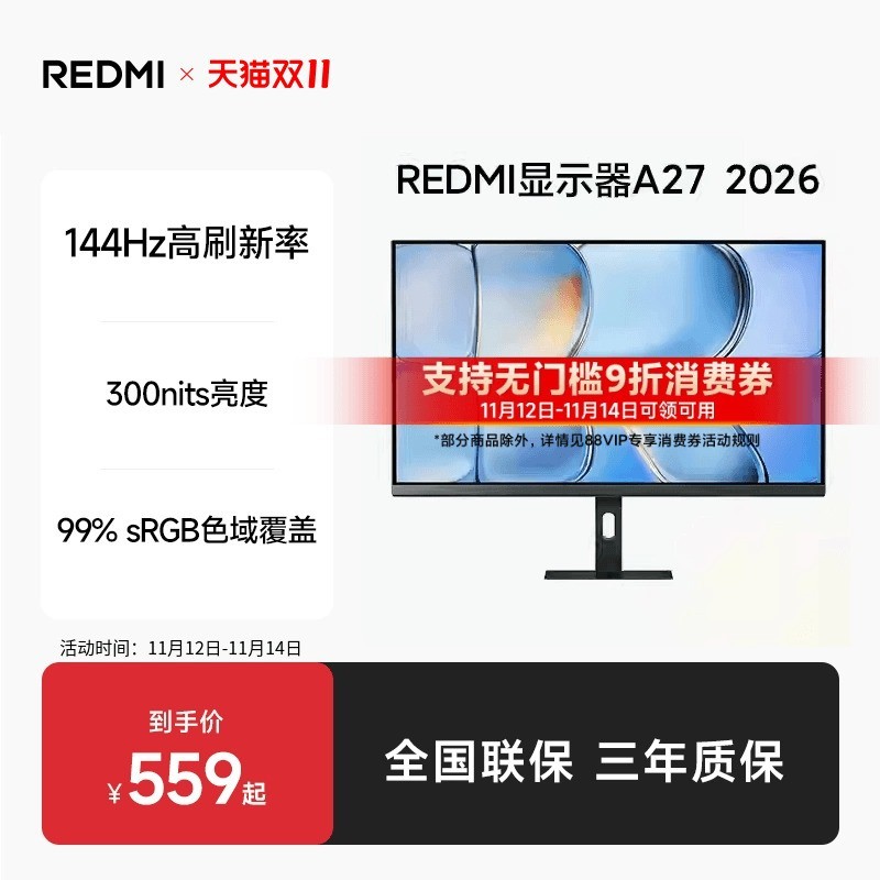 红米P27FBA - RA 27英寸显示器正在进行优惠活动!这款显示器原价559元,现在天猫精选活动售价559元,参与补贴5%起减27.95元优惠活动,下单1件,实付低至448元。它整体造型轻薄,仅厚7.5mm,简约美观,支架处可进行俯仰角度调节,能满足不同使用姿态,还支持壁挂。屏幕采用主流的三窄边框设计,拥有178°广视角,搭载27英寸IPS面板,具备19201080分辨率和100Hz刷新率。色彩方面支持HDR 10、8bit色深、99%sRGB色域覆盖,且△E<2,既能满足高效办公需求,又能兼顾日常影音娱乐。