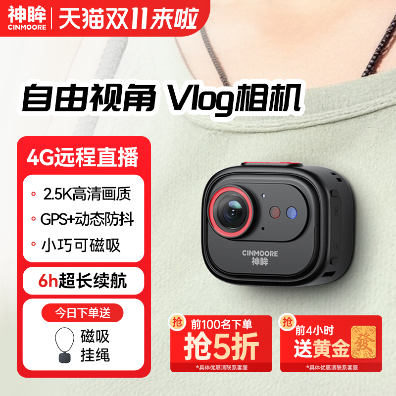神眸全新推出Cinmoore Vlog相机BC6V 64G版本,搭载400万高清画质,支持4G网络实现实时远程直播,无论是旅行记录、日常vlog还是直播带货都能轻松应对,内置大容量电池确保长时间拍摄不断电,满足全天候使用需求,轻巧便携设计搭配磁吸挂绳更方便固定与多场景拍摄,11月14日20点、22点、23点开启双11半价秒杀专场,64G版本活动价仅559元,叠加多重优惠包括最后4小时下单享95折减26元、官方立减100元、拍0.01元预约抵10元、88VIP领取9折消费券再减42.3元,每场前10分钟前20名付款用户更有机会抢5折惊喜,晒单还返10元红包,多重福利叠加后最低到手价仅180.3元,今日下单即赠黄金礼品,加赠磁吸挂绳,参与活动还能赢取更多好礼,更享99年免费流量和12期免息分期,顺丰极速发货,原价185.70元,现在入手立省实惠,品质生活从一台神眸Vlog相机开始。