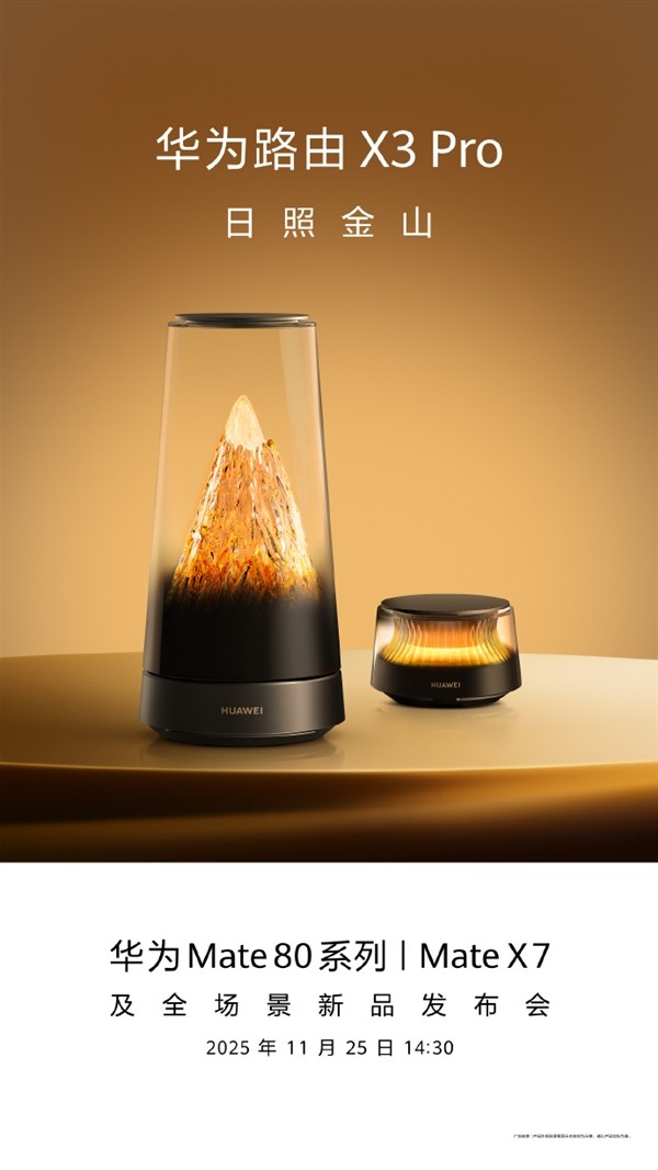 华为终端于今日发布了一款新品路由器的展示图,呈现了X3 Pro日照金山款的独特设计。根据官方信息,该产品将于11月25日正式推出,同期亮相的还有Mate 80系列与Mate X7机型。由于此前已开启预售,新品在发布后将同步开启销售。