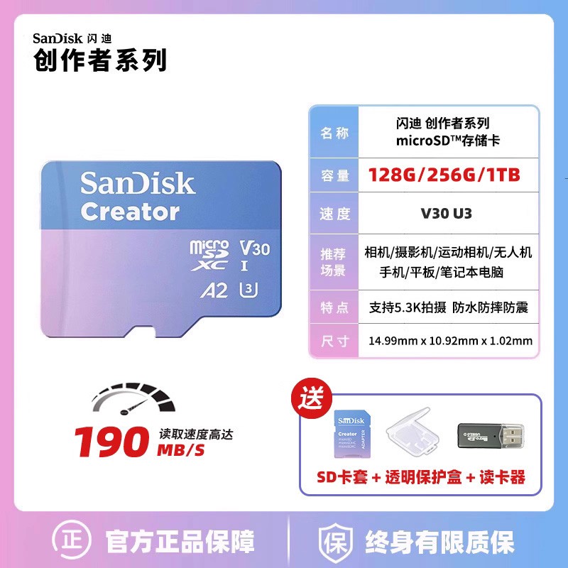 SanDisk闪迪创作者TF内存卡是一款适配大疆Pocket3相机、影石等设备,还能用于Switch的高性能存储卡。它拥有128g和256g不同容量可选,能满足多样存储需求。