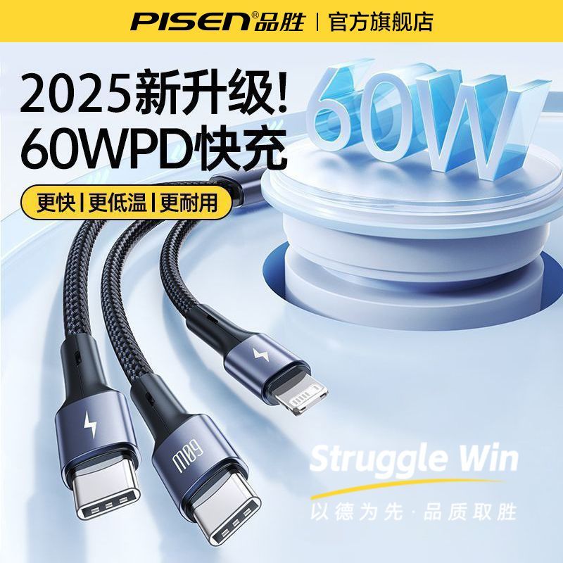 品胜三合一编织数据线,支持60W快充,是一拖三的typec快充线,既适用于苹果17设备,也能为安卓设备充电,还可用于车载充电。这款数据线采用编织设计,耐用又实用。