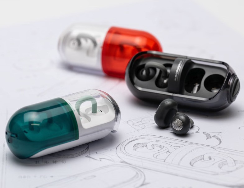 先说设计,这玩意第一眼就不太像耳机,更像一颗小药丸:胶囊造型、半透明旋转充电仓,一拧180°就能打开,磁吸固定耳机,玩起来还挺解压。这个设计可不是花架子,人家还拿了“全球未来设计奖”,属于既好看又有点来头的那种。