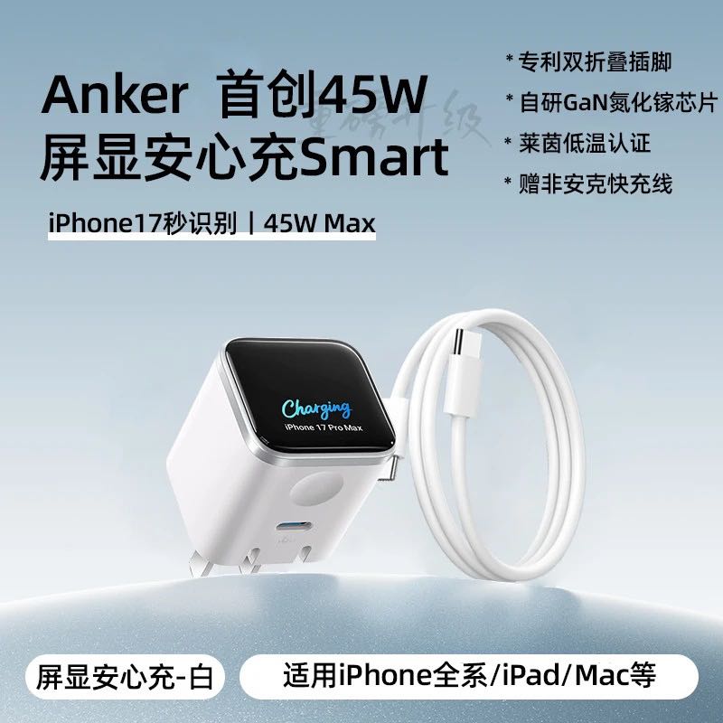 拼多多百亿补贴来袭!安克 45W 屏显安心充 Smart 充电器搭配 1m 快充线,现在有超划算的活动。这款安克(Anker)手机充电器,使用苹果同厂 Power Integrations 芯片,能与 iOS 系统同步升级,不弹窗、发热低、辐射低,让你使用更安心,适用于 iPhone 8 及以上机型。它采用创新堆叠设计,三维排布减小体积;全新高集成方案,效率更高、发热更少;重新构建变压器,降低磁芯损耗、提升效率。接口为 Type - C 接口,支持 20W 大功率闪充,充电速度快。而且超强兼容,苹果设备如手机、iPad 都能充,旅行出差一套搞定,轻松减负。产品尺寸 282846mm,重 30g。