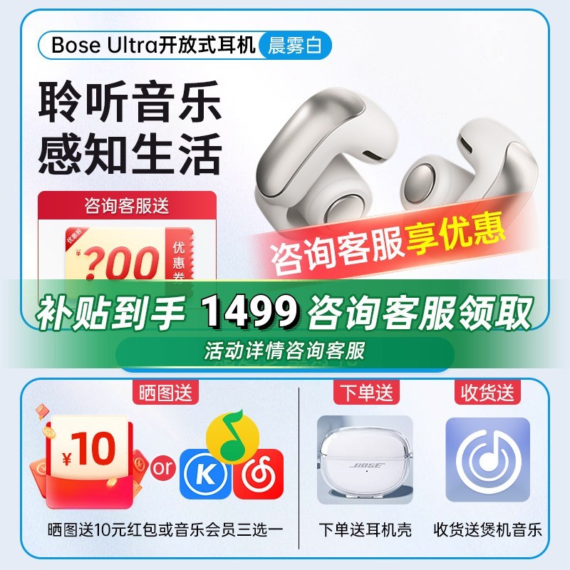 BOSE Ultra open开放式无线蓝牙运动耳机挂耳夹耳空间音频不入耳,现有开放式可选。这款耳机采用开放式设计,不入耳,佩戴舒适,特别适合运动场景。其具备无线蓝牙功能,使用起来更便捷,还能带来空间音频体验。