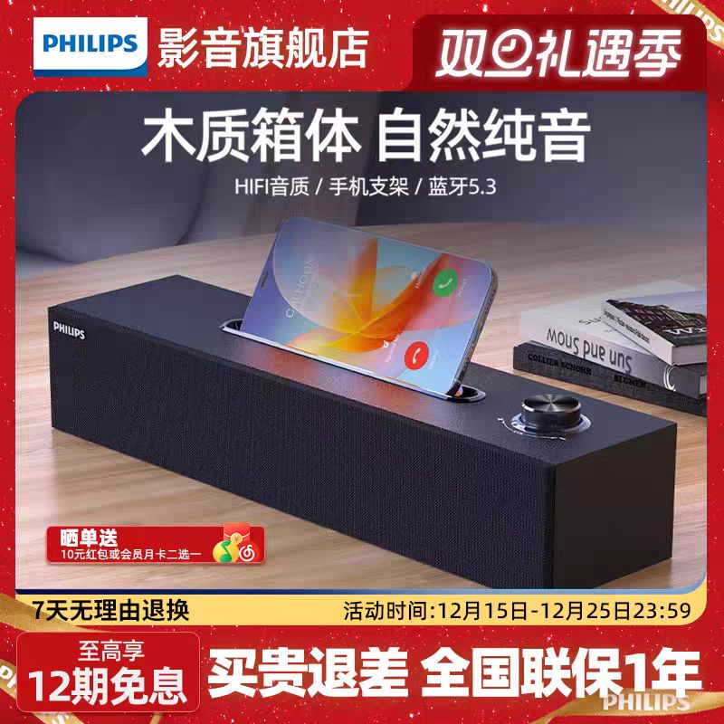 飞利浦SPA3808木质音箱采用经典木质箱体设计,外观简约大气,适用于电脑、台式机、笔记本及手机等多种设备,无论是办公桌面还是居家环境都能轻松融入。支持蓝牙无线连接,操作便捷,即连即用,带来稳定流畅的音频传输体验。音响音质清澈饱满,低音浑厚,高音通透,打造沉浸式听觉享受。兼具手机支架功能,边听音乐边看视频更方便,实用性与美观性兼具。