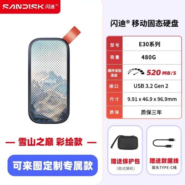 闪迪E30移动硬盘固态480G高速外接SSD震撼促销中!这款高性能移动硬盘兼容手机与电脑,支持Type-C接口,传输速度快如闪电,无论是大文件传输还是视频剪辑都能轻松应对,更完美适配Mac系统,即插即用无需繁琐设置。小巧便携设计,随身携带无负担,是办公、学习、创作的理想存储伴侣。