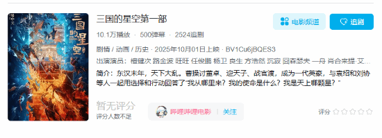 易中天担任总顾问的动画电影三国的星空第一部已于近日在主流视频平台上线。截至2026年1月31日,该片在豆瓣平台获得7.2分的综合评分。