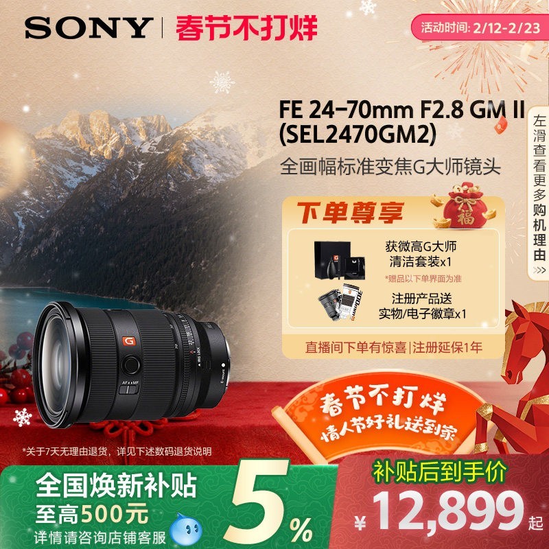 索尼SEL2470GM2 FE 24 - 70mm F2.8 GM II全画幅标准变焦G大师镜头正在天猫商城促销,原价13799元,最终到手价仅13399元/件。这款镜头为小型化轻量化的索尼微单™系统设计,是索尼最轻最小的24 - 70mm恒定F2.8光圈变焦镜头,重约695g,相比上一代轻约20%,长度减少16mm,体积减少约18%。它采用紧凑和轻量化镜身设计,画质表现出色,全开光圈下也有高分辨率。重新设计的光学结构有5枚非球面镜片(含2枚高精度XA镜片)、2枚ED和2枚Super ED玻璃镜片,结合新浮动对焦设计,有效控制色差等问题,在整个变焦范围和不同光圈下,从中心到边缘成像区域都有优异分辨率。其采用索尼第二代纳米AR镀膜技术,能抑制眩光和鬼影。凭借先进光学设计和11枚叶片圆形光圈,可呈现柔美背景虚化效果。在整个变焦范围内近摄性能出色,24mm处最近对焦距离仅0.21米,70mm处为0.3米,最大放大倍率达0.32倍。通过四个索尼原创的XD线性马达等技术,拍摄快速移动物体时可实现安静、快速、精准、可靠的自动对焦,30张/秒高速连拍或录制4K 120p视频时也能持续精准自动对焦。