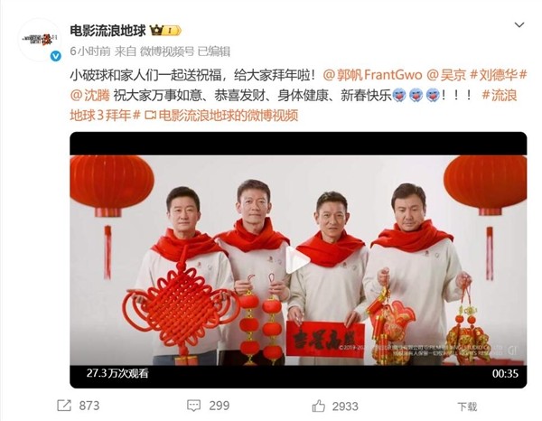 2026年2月17日正值农历正月初一。电影流浪地球官方社交媒体平台发布新春贺岁视频,吴京、郭帆、刘德华、沈腾联袂出镜,向观众致以诚挚的新春祝福。