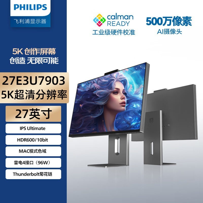 飞利浦27英寸5K创作屏7E3U7903,搭载IPS Ultimate面板,支持5120×2880超高清分辨率,专为设计师、摄影师和视频剪辑师打造,色彩精准、视野宽广、细节纤毫毕现;目前天猫精选活动售价8234元,下单可领满5000减350元优惠券,并叠加立减1235元,单件实付仅需6649元,上新首发限时特惠,入手即享专业级创作体验。