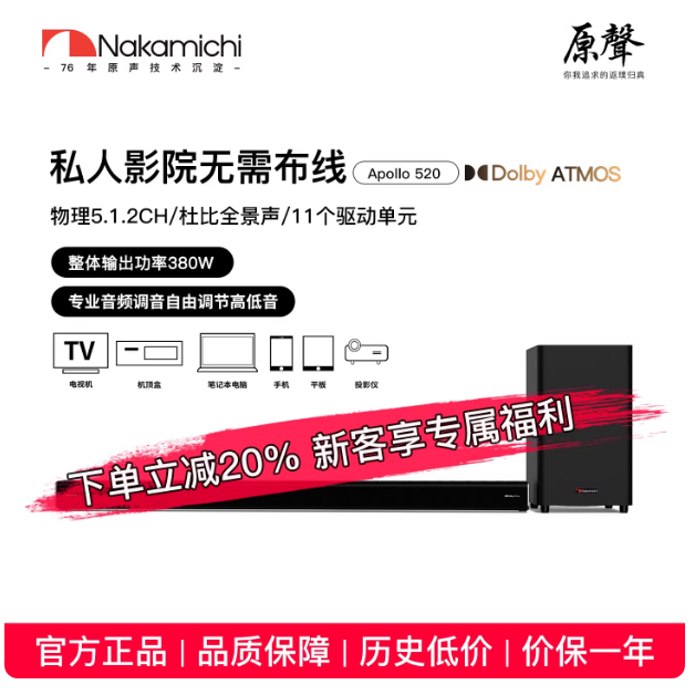 Nakamichi中道Apollo520回音壁音响套装,拥有5.1.2声道,能为你带来沉浸式的音频体验。
