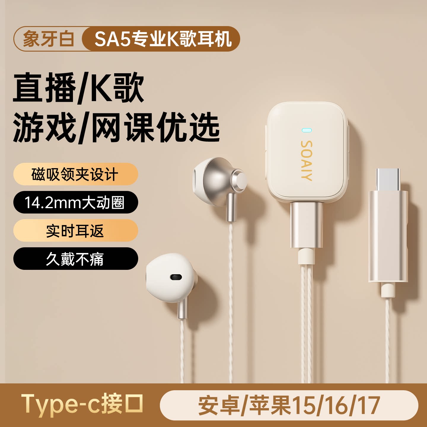 索爱SA5有线全民唱K歌耳机是一款自带声卡麦克风的好物,具备实时耳返功能,无论是直播PK还是录歌都非常适用。它有象牙白的颜色选择,还配备磁吸领夹,同时赠送收纳包。