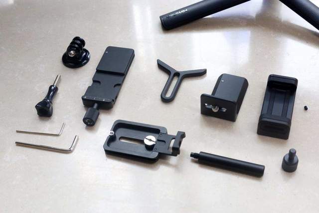 由于是多设备兼容,你会发现包装内包含了有很多的配件,包括微单、单反、卡片机使用的相机快装板、三脚架、固定板滑块、镜头支架、各种螺丝以及手机使用的手机夹具和GoPro使用的转接头,连固定用的六角螺丝都给准备了,非常丰富。另外还有各种控制线,包括索尼、松下等等控制线,兼容大部分品牌的相机,这样的话可以通过控制线连接相机与稳定器,通过稳定器控制相机操作。