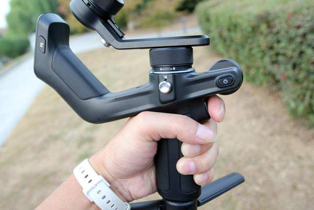 竖向手柄食指位置这颗按键是扳机键,双击它可以进行复位,三连击可以进入自拍模式,按住则进入双轴跟随模式,虽然感觉这些按键的功能很丰富,但多体验几次基本也能够记住了。