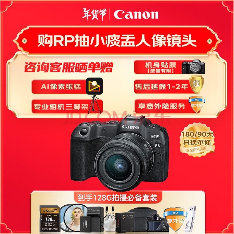 佳能EOS R8是一台被定义为全画幅微单普及之作的机型。它拥有2420万像素的成像能力,并且还可以拍摄6K超采样的4K视频。搭载的第二代全像素双核CMOS AF对焦系统,不仅速度快、精度高而且还可以识别多种主体。作为普及型全画幅微单相机,佳能EOS R8包含了24-50mm镜头的套机价格是11460元,套装内包含了64GB存储卡,性价比非常高。