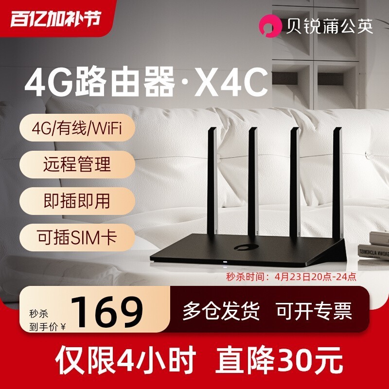 蒲公英4G插卡路由器X4C是一款功能强大的全网通CPE设备,支持4G与有线网络自由切换,轻松实现无线SIM卡上网,同时具备远程管理及异地组网的智能功能,非常适合家庭、办公室或移动场景使用。现在参与天猫百亿加补节秒杀活动,到手价仅需169元,较原价199元直降30元!此外,...