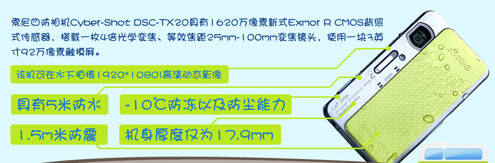 作为一台三防相机,强悍的防护能力自然是必不可少的,索尼TX20具有5米防水、1.5m米防震、-10℃防冻以及防尘能力。四重防护使得相机能轻松应对潮湿、干燥多尘或雨雪的拍摄环境。索尼TX20配备了一块1620万有效像素的背照式Exmor R CMOS传感器,相比于传统的CMOS传感器,背照式传感器……[详细]